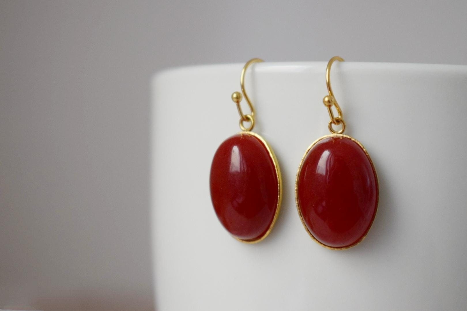 13 x 18 mm oval shaped gold plated frame & ears hooks are made of with high quality real 18k gold plated surgical stainless steel material 13 x 18 mm oval shaped gold plated frame & ears hooks are made of with high quality real 18k gold plated surgical stainless steel material. Oval shaped deep red jade cabochons, jewelry glue. In total, the ears are about 3 cm long.Highlights