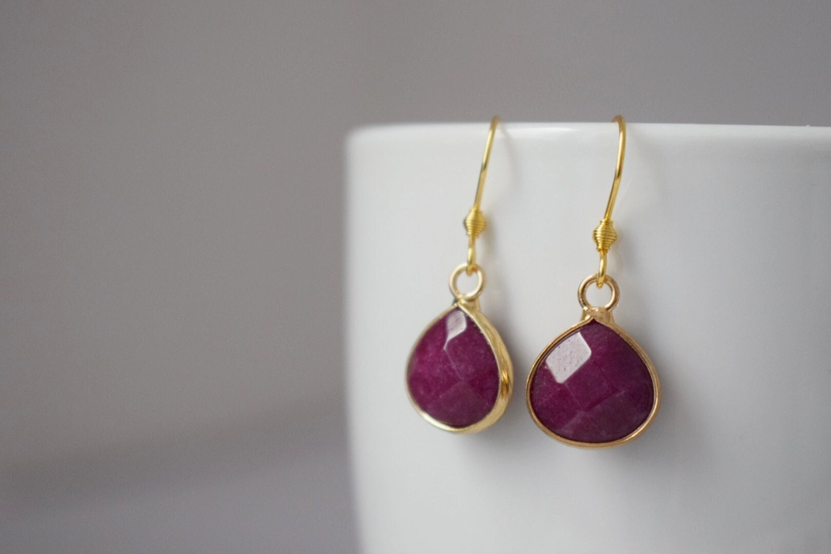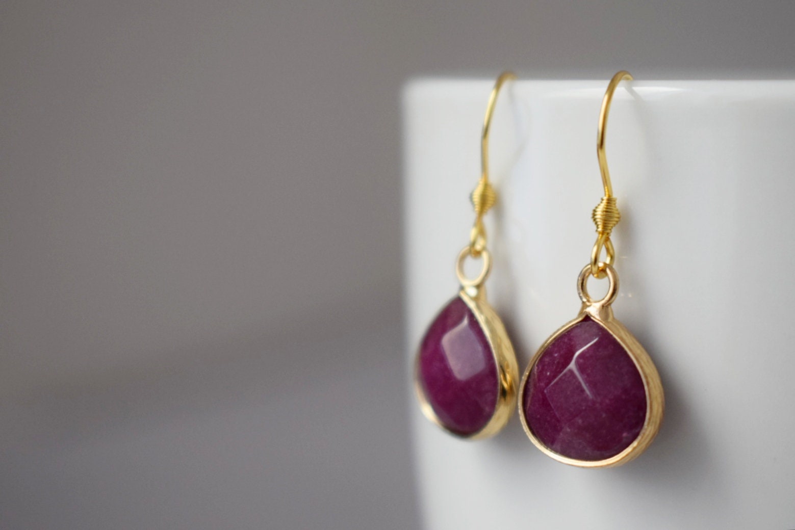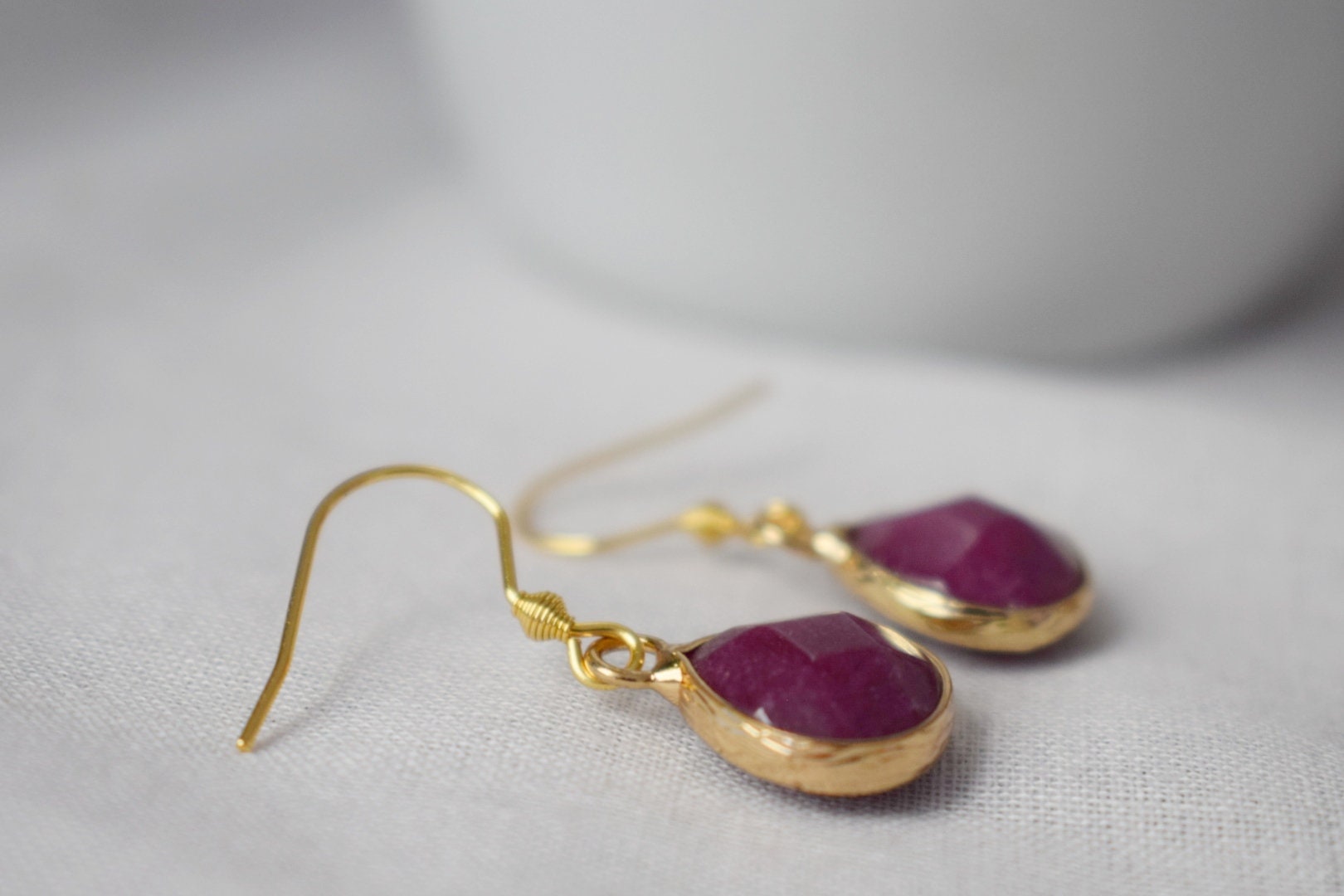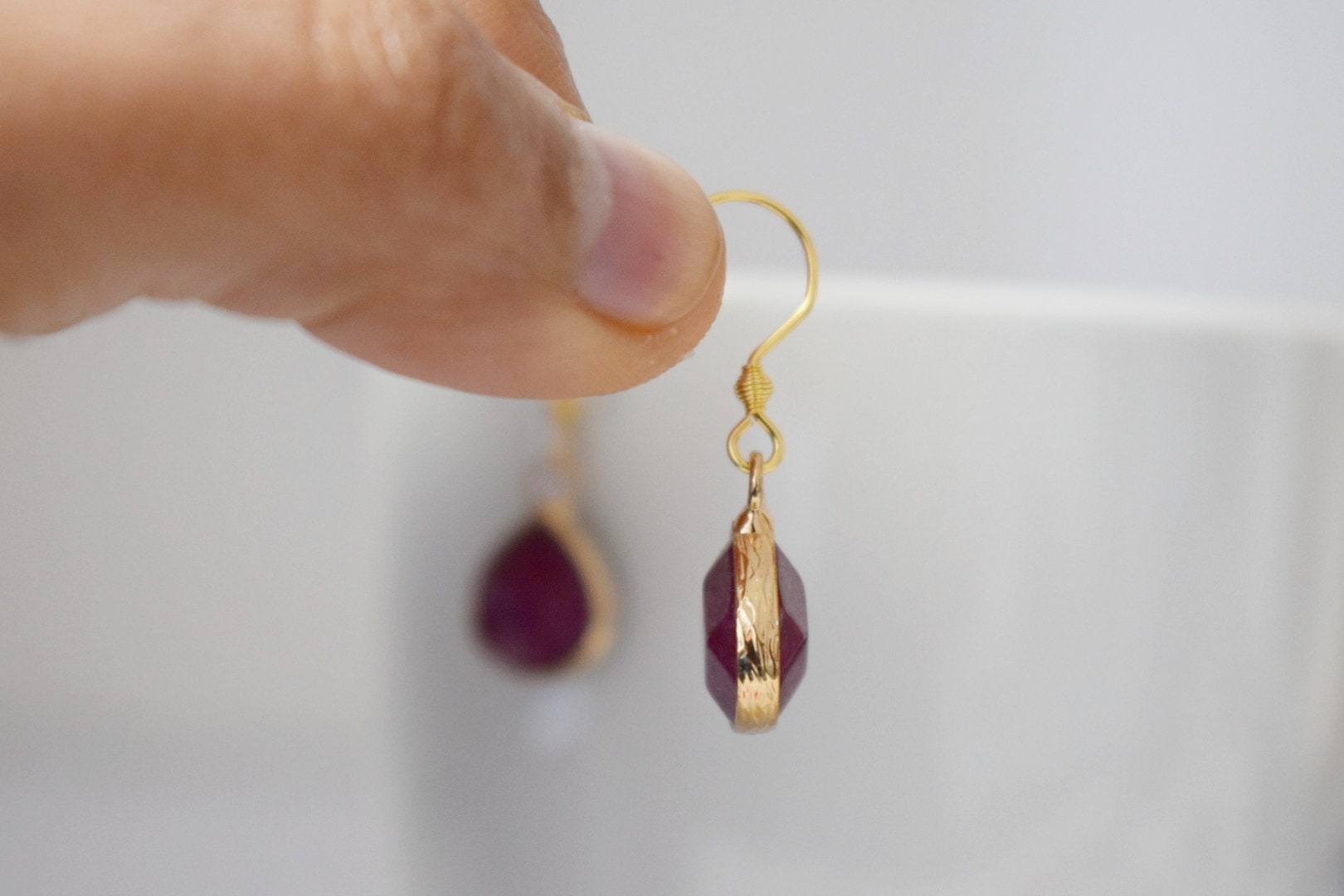 Red Jade Earrings Gold, Teardrop Wine Red Faceted Pendant, Gemstone Hanging Earrings, Dangle Drop Earrings Women, Jade Jewelry, Gift For Her