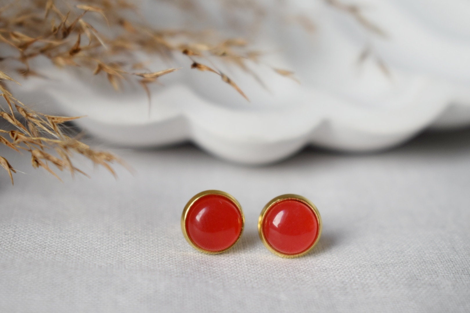 Red Jade Stud Ears, 18k Gold Plated, 8mm Round Gemstone Ears, Small Red Studs, Minimalist Jewelry, Birthday Anniversary Gift For Her