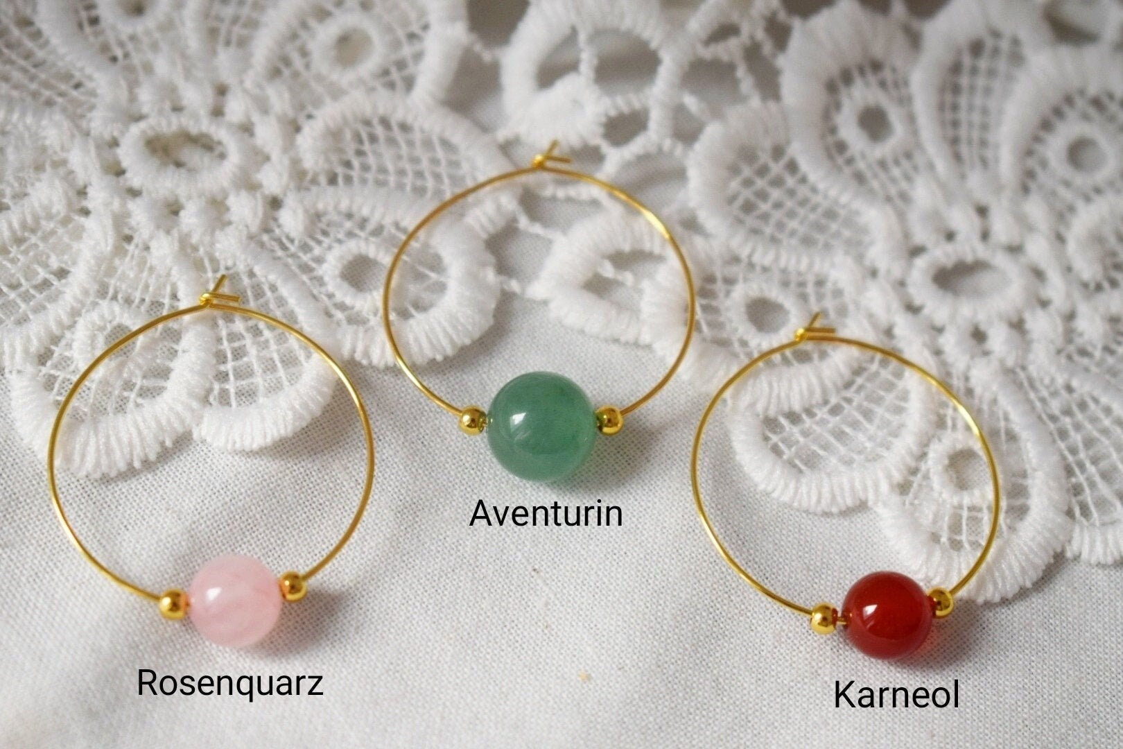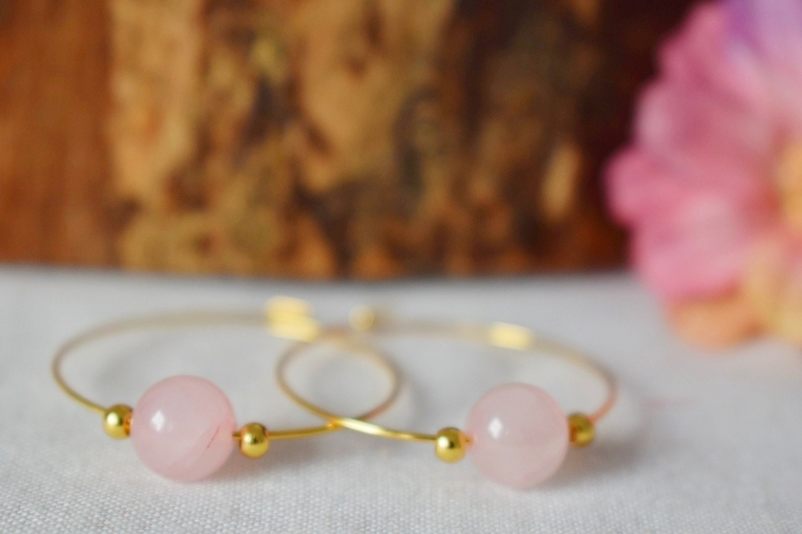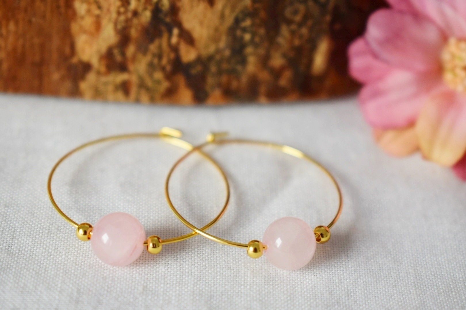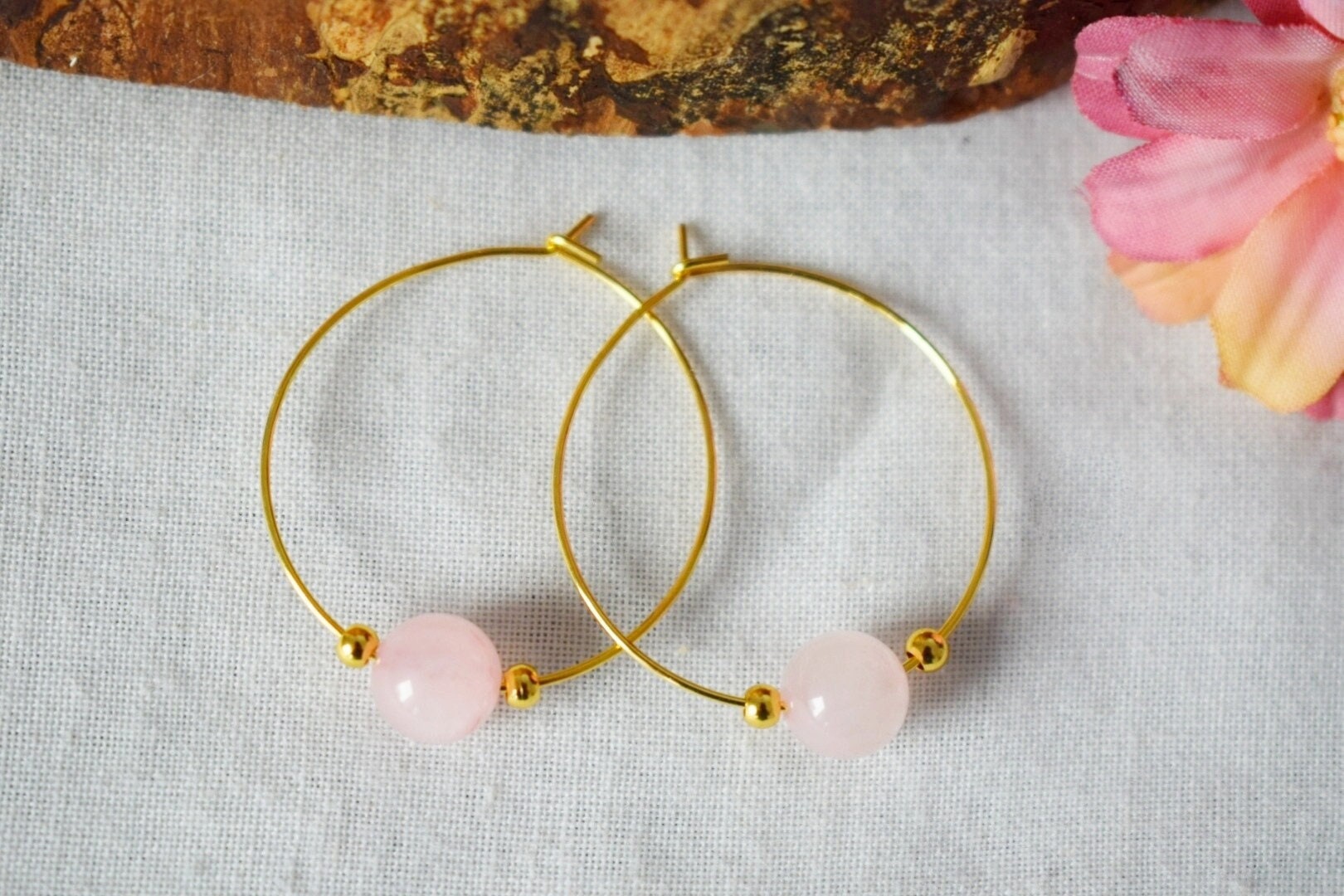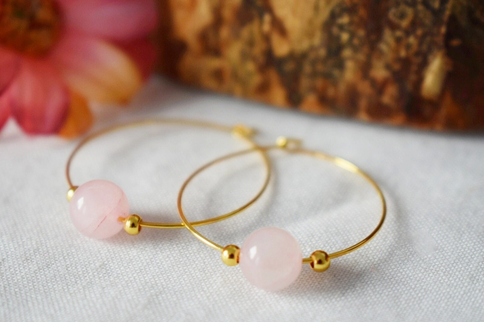 Rose quartz hoop earrings, 18k gold plated surgical stainless steel hoops, Gemstone beaded jewelry, Gift for her, Best Christmas gift