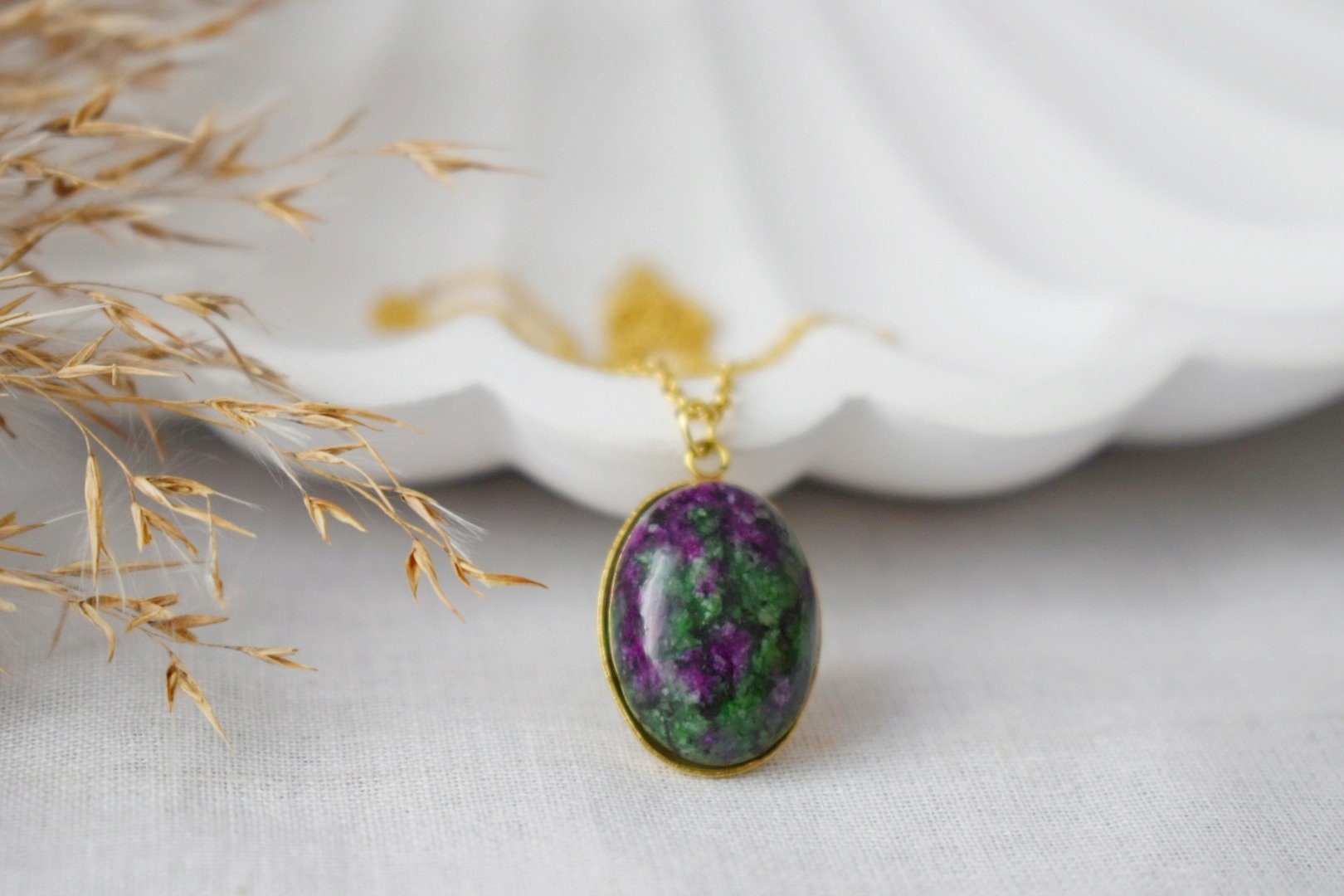 Ruby In Zoisite Gold Necklace Oval, Ruby Zoisite gemstone pendant, Green, Pink, Green stone, Ruby Fuchsite, Ruby in Zoisite Jewelry, Gift