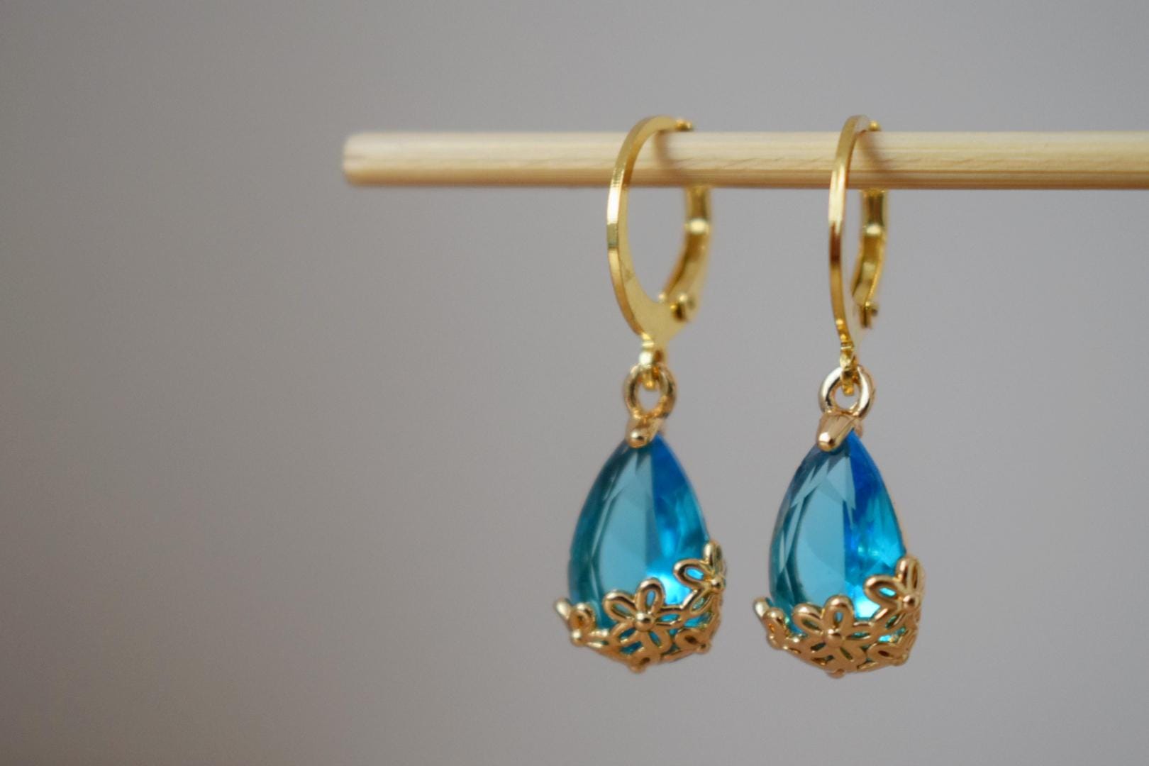 Sky blue rhinestone teardrop earrings with 24k gold plated stainless steel huggie hoops, Minimalist ornament jewelry