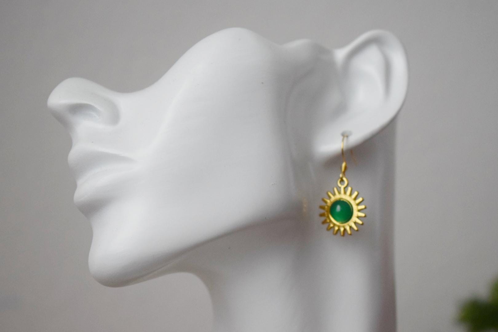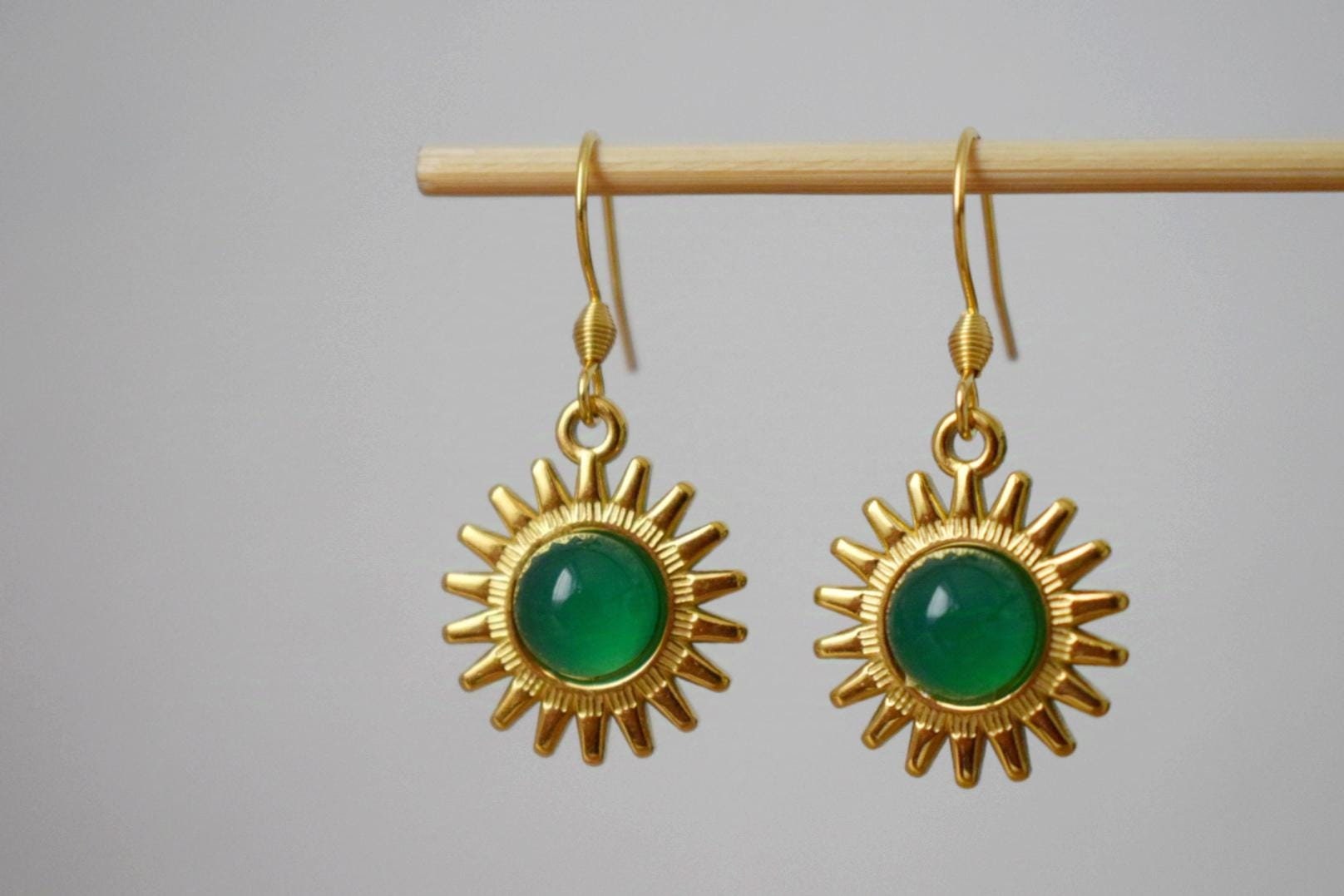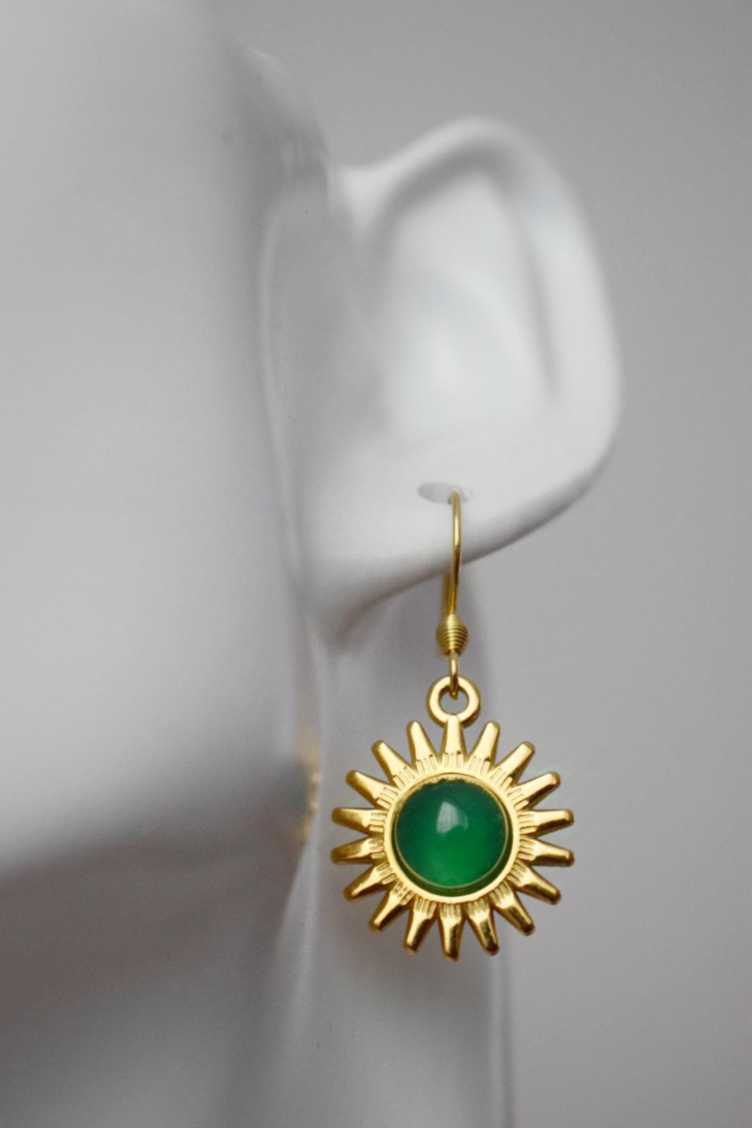 Sun earrings, Green agate earrings, Gemstone earrings, Sun rays, Sunburst, Celestial, Gold plated glowing jewelry, Christmas gift for her
