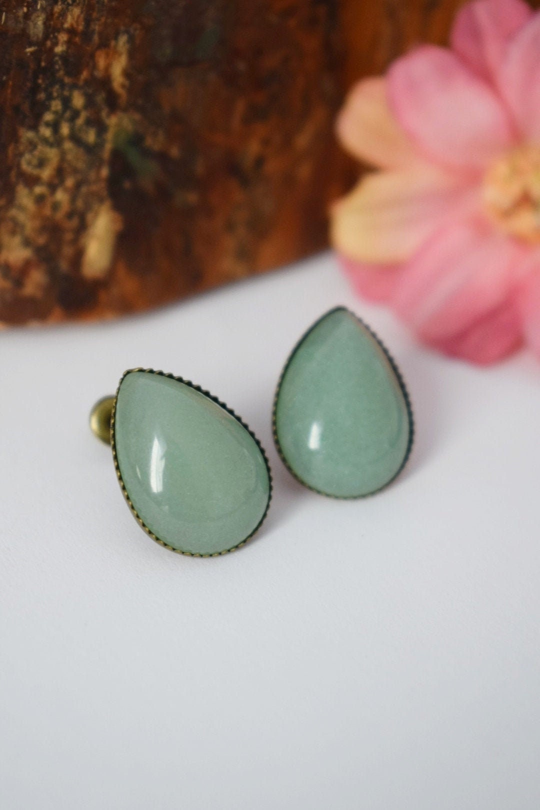 Teardrop Aventurine Stud Earrings, Green Gemstone, Antique Bronze, Vintage Birthstone Earrings, Gift for her
