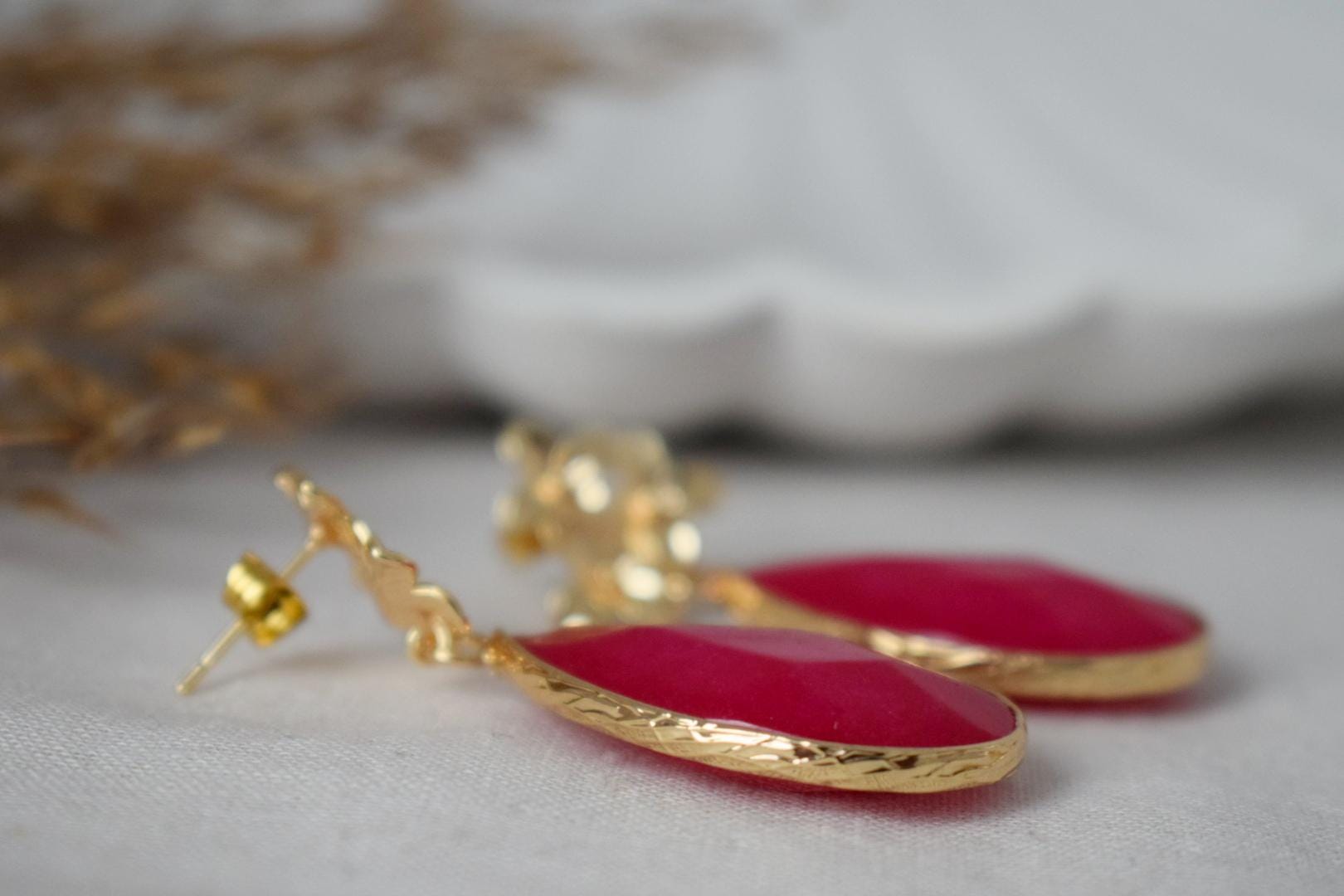 Teardrop pink jade stud earrings, Flower dangle drop earrings, Long gemstone earrings, Faceted stone, Boho chic jewelry, Mother's day gift