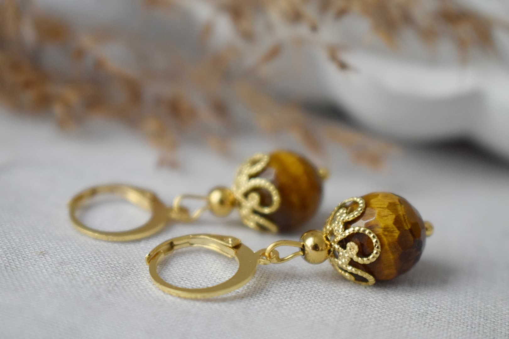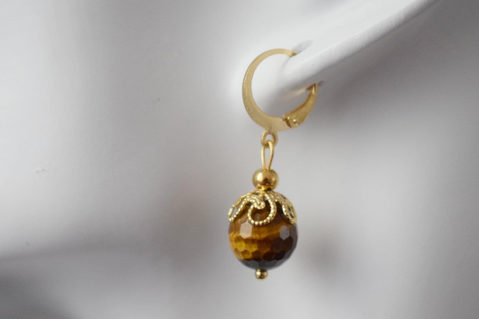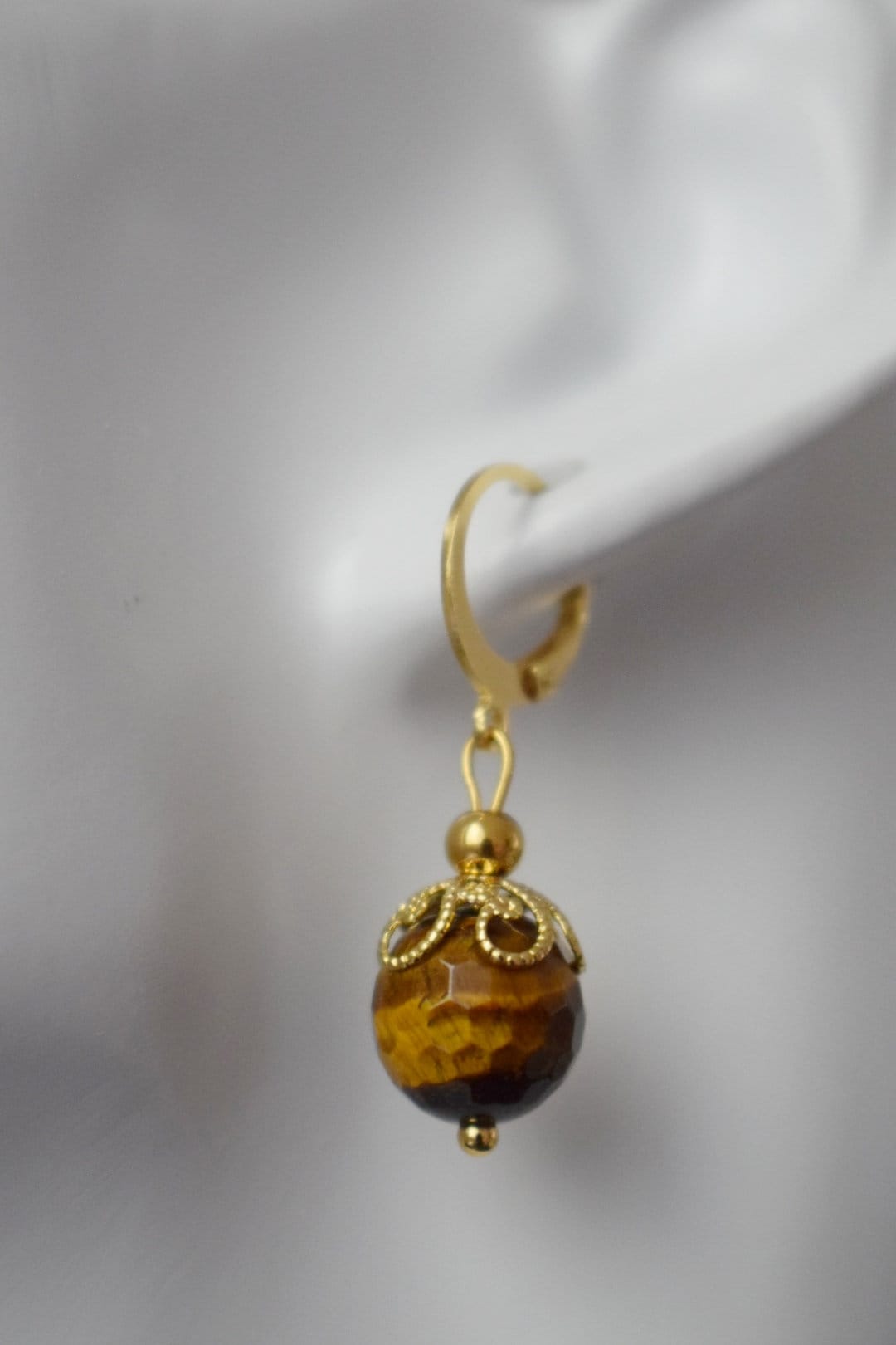 Tiger eye hoop ears, Huggie gemstone ears, Brown gold stone, Tiger's eye, Round, Lever back, Tiger eye bead, Jewelry gift for her