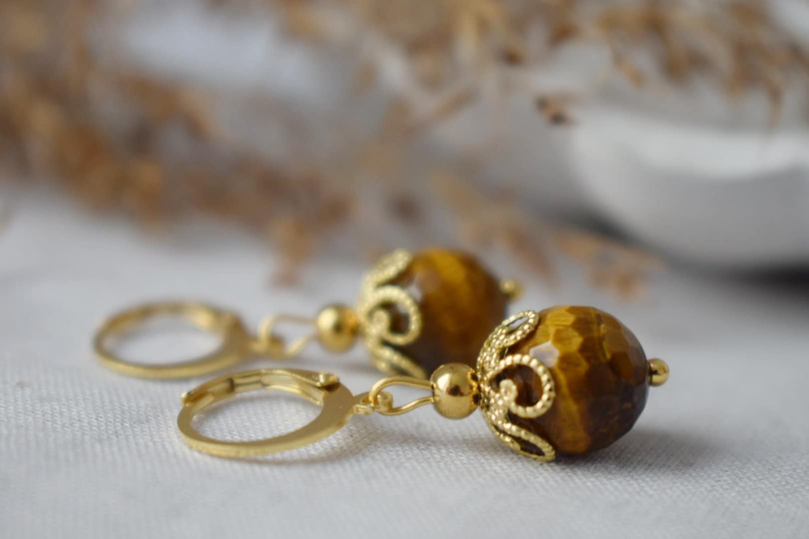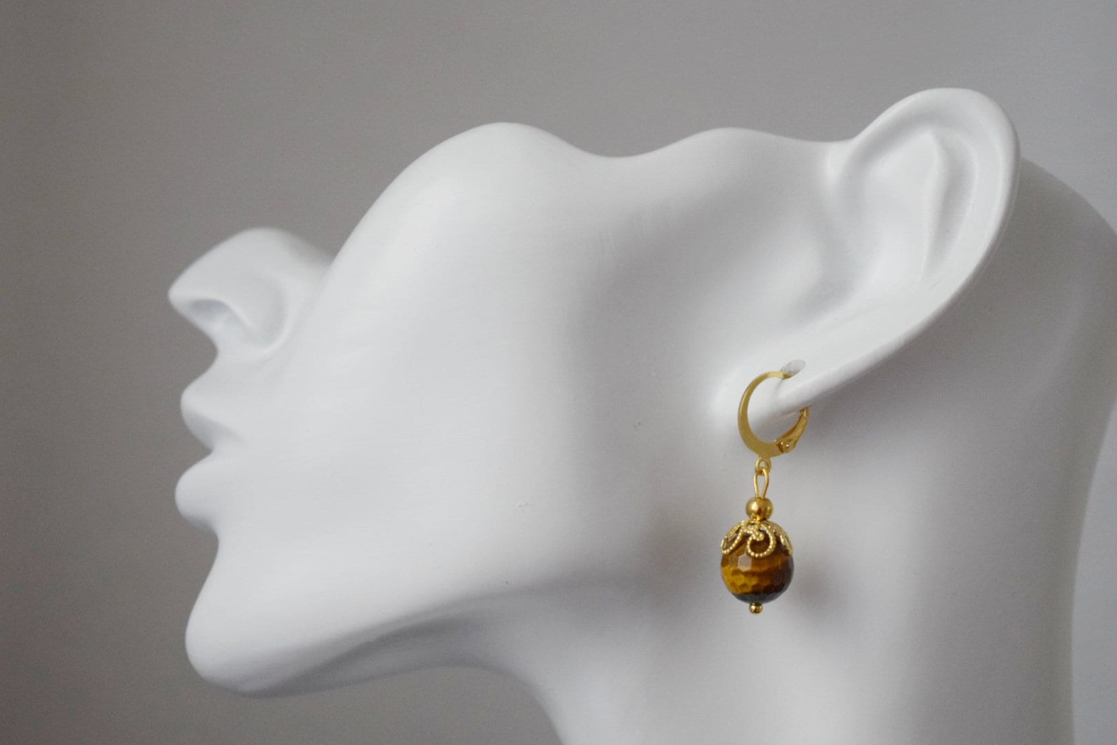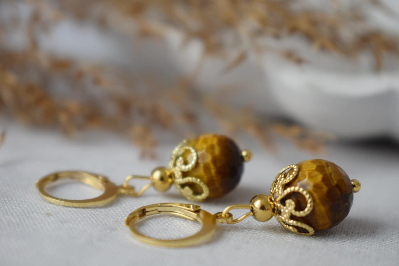 Tiger eye hoop ears, Huggie gemstone ears, Brown gold stone, Tiger's eye, Round, Lever back, Tiger eye bead, Jewelry gift for her