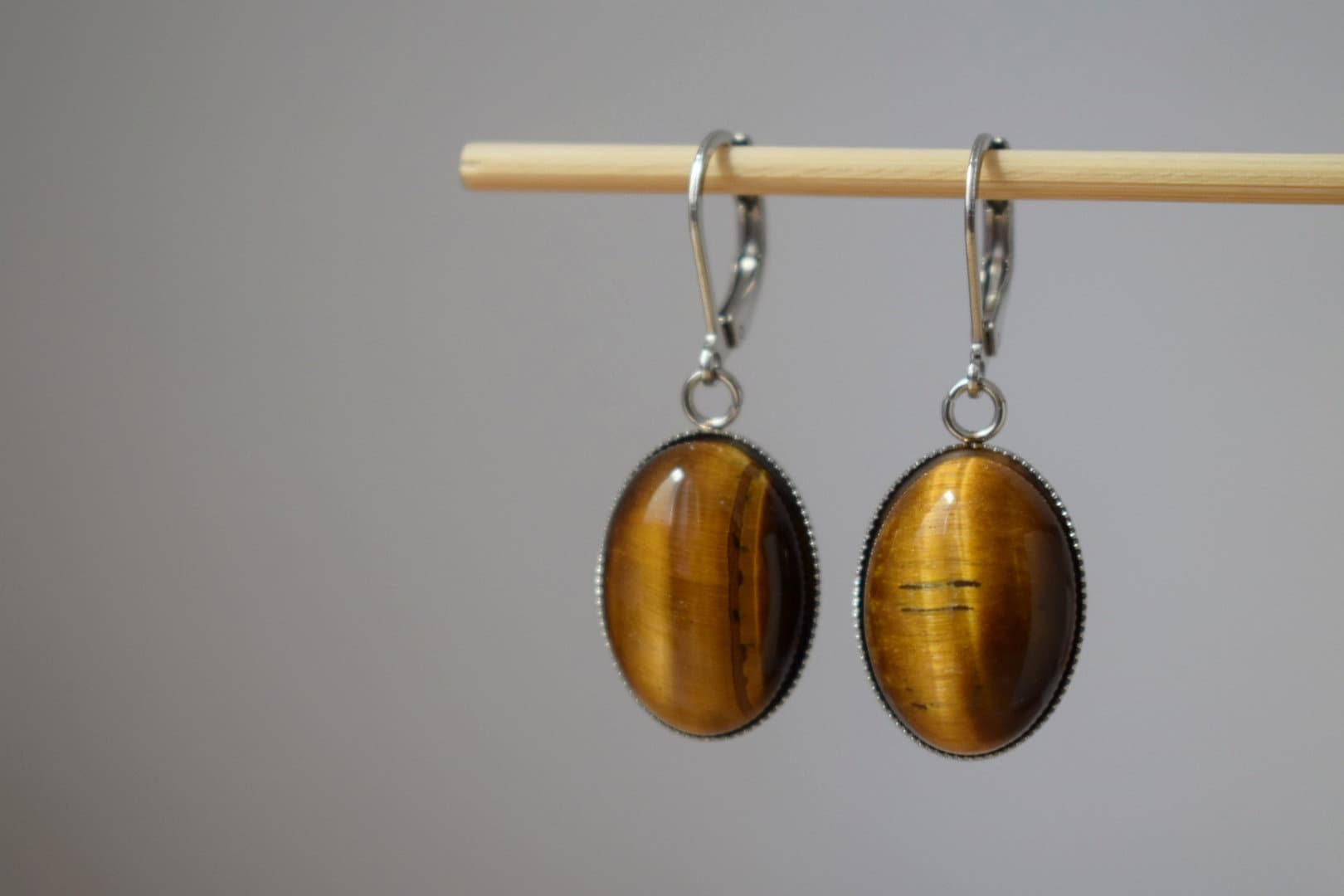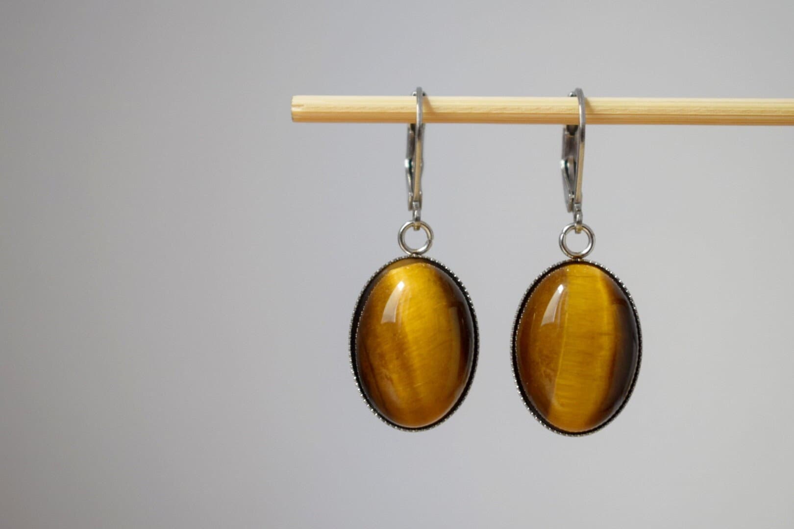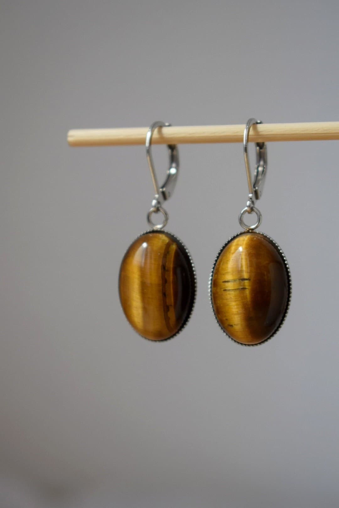 Tiger's eye huggie hoops ears, Oval gemstone pendant charm, Gold brown stone dangle ears, Chakra jewelry for women, Christmas gift