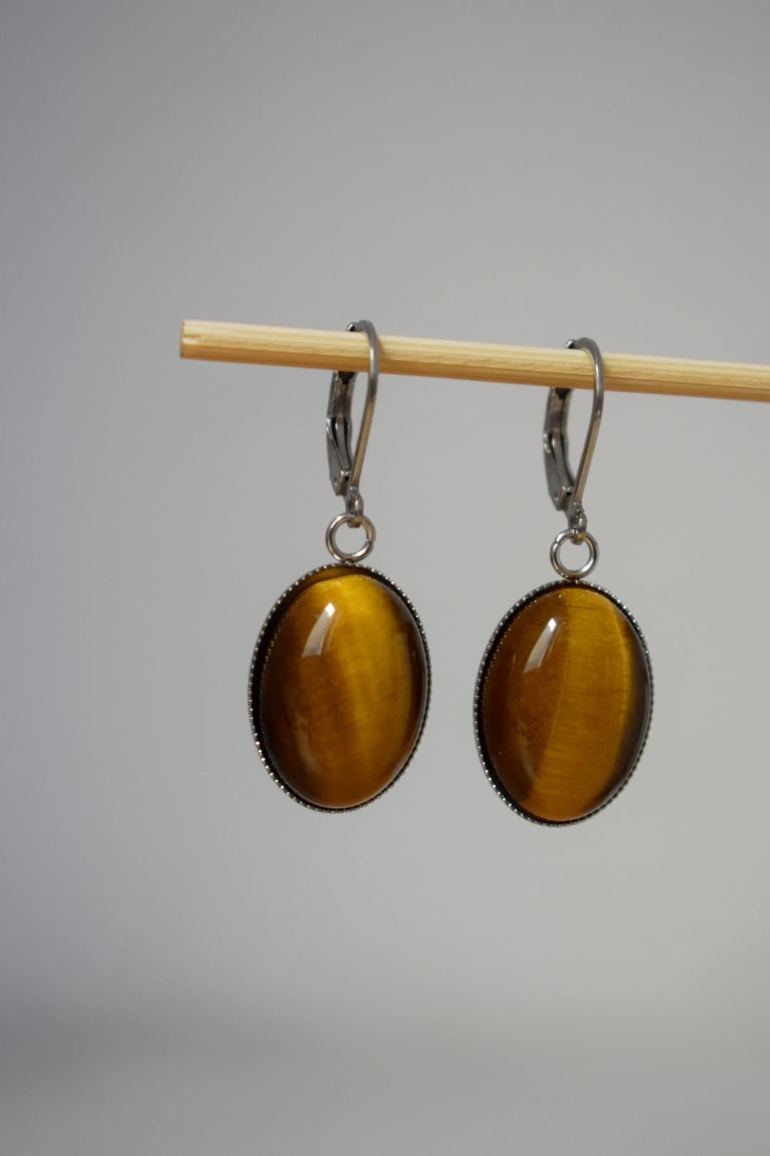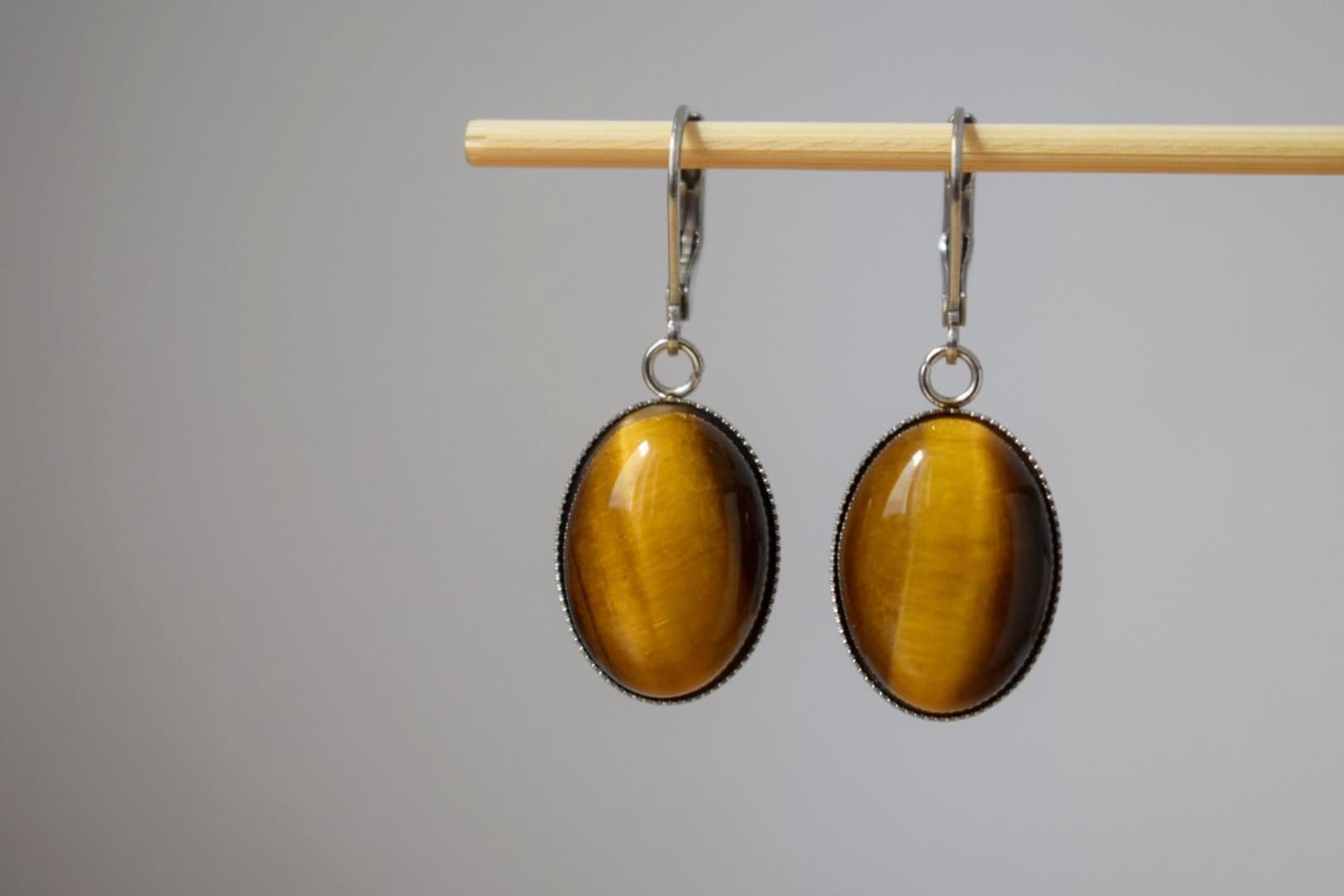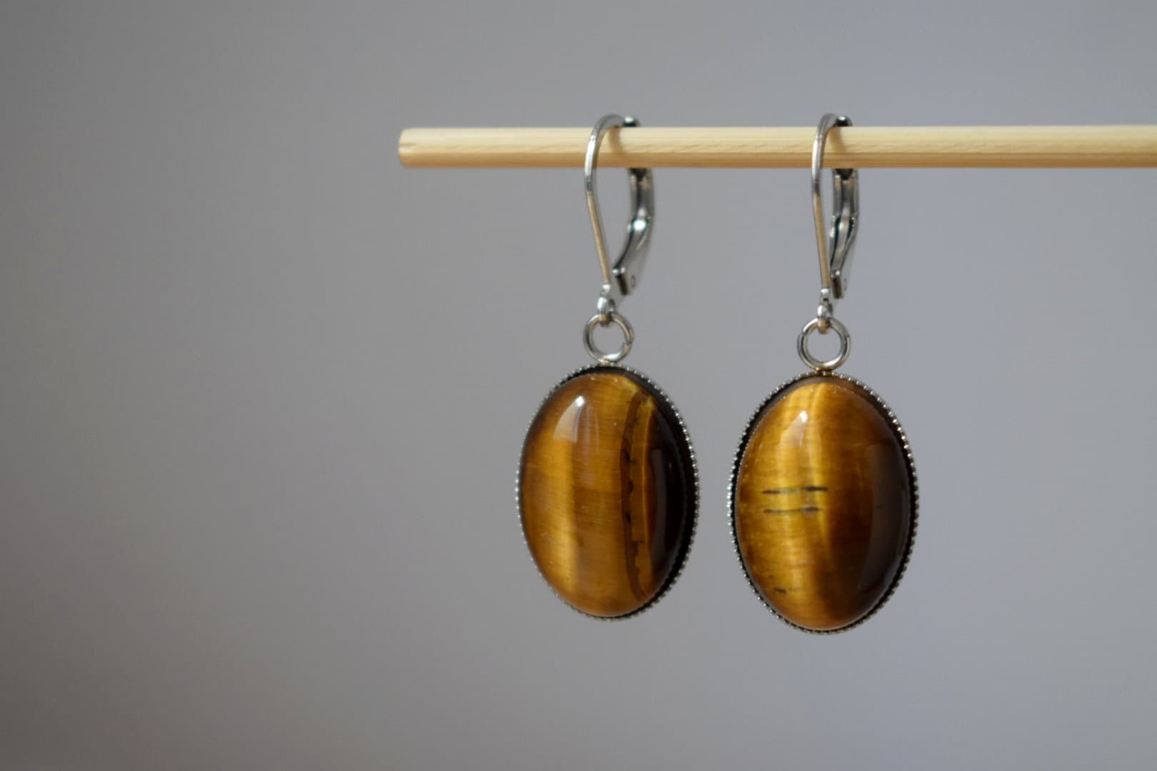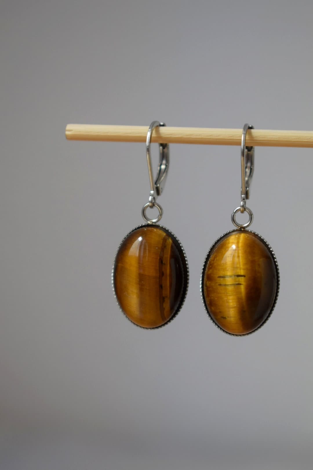 Tiger's eye huggie hoops ears, Oval gemstone pendant charm, Gold brown stone dangle ears, Chakra jewelry for women, Christmas gift