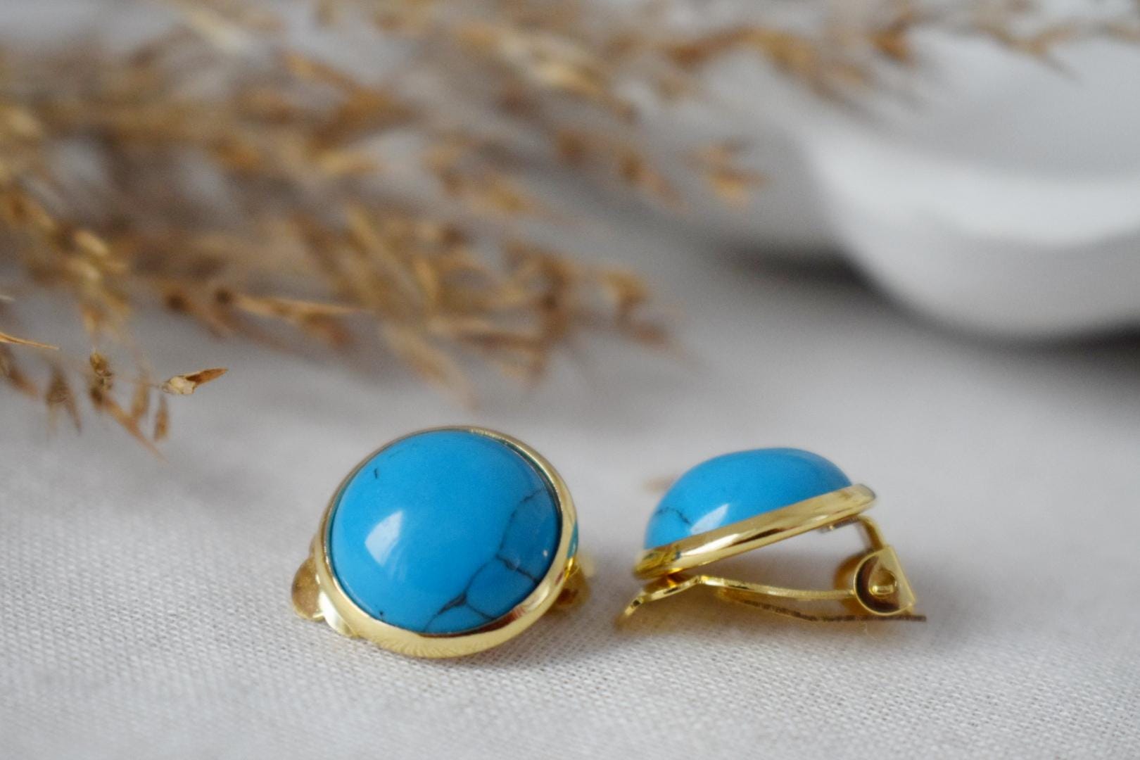 Turquoise clip on earrings, Blue gemstone ear clips, Turquoise jewelry, Non pierced earrings, No hole earrings, Handmade jewelry gift
