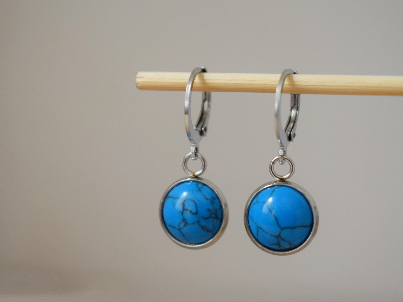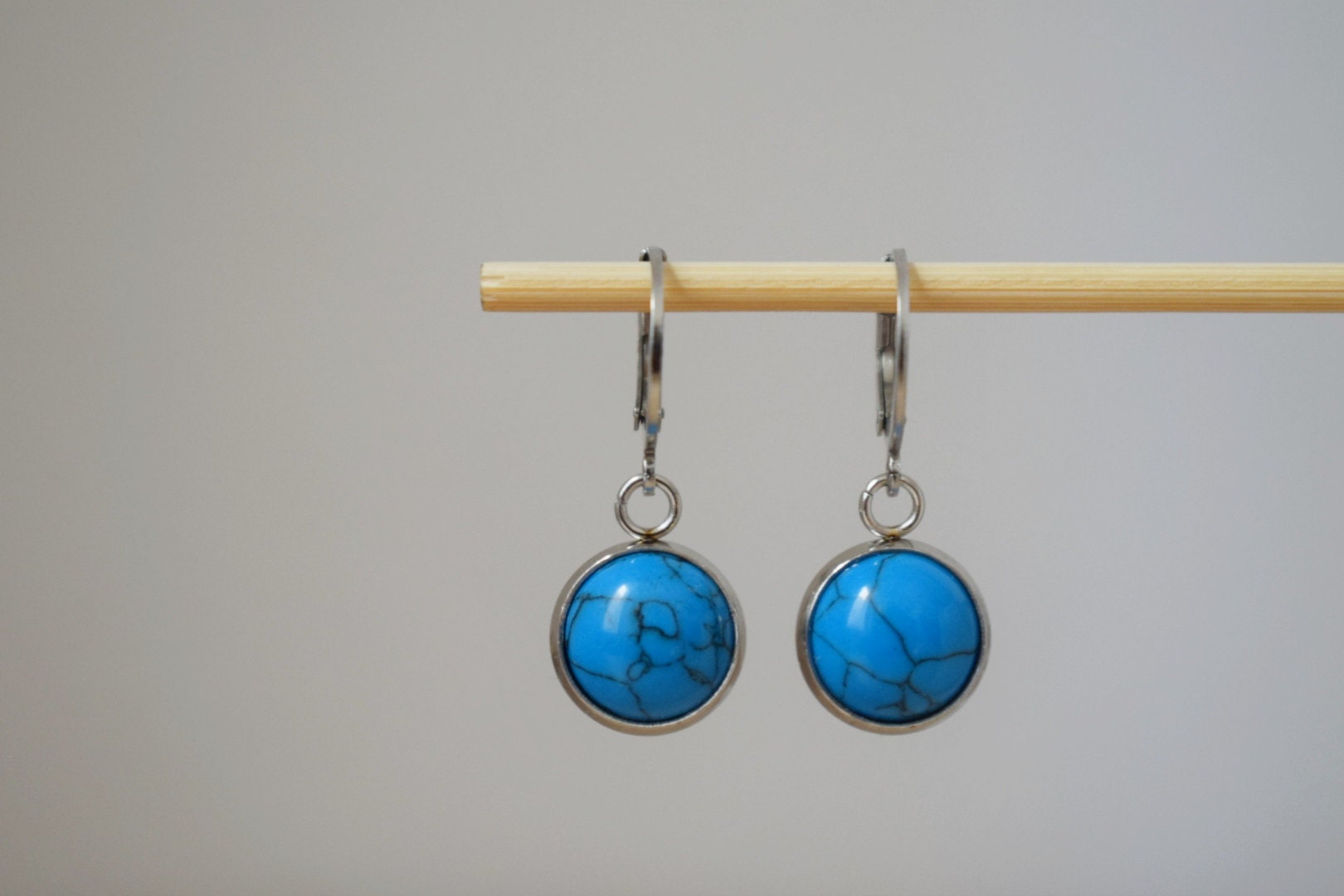 Turquoise earrings, Huggie earrings with turquoise pendant stainless steel, Round gemstone hoops, Small boho jewelry, Gift for her