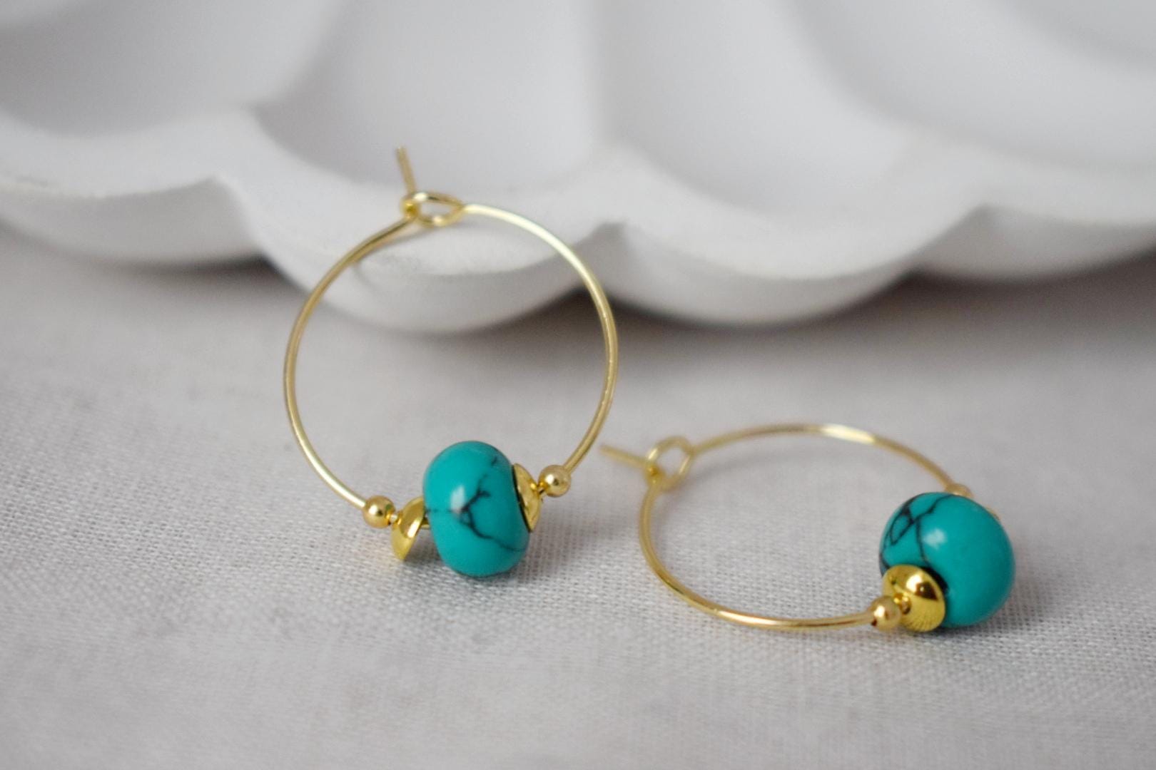 Turquoise hoop earrings, Minimalist gemstone hoops, Turquoise beads, 18k Gold plated stainless steel, Handmade jewelry, Gift for her