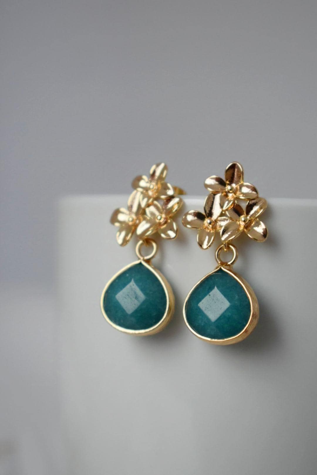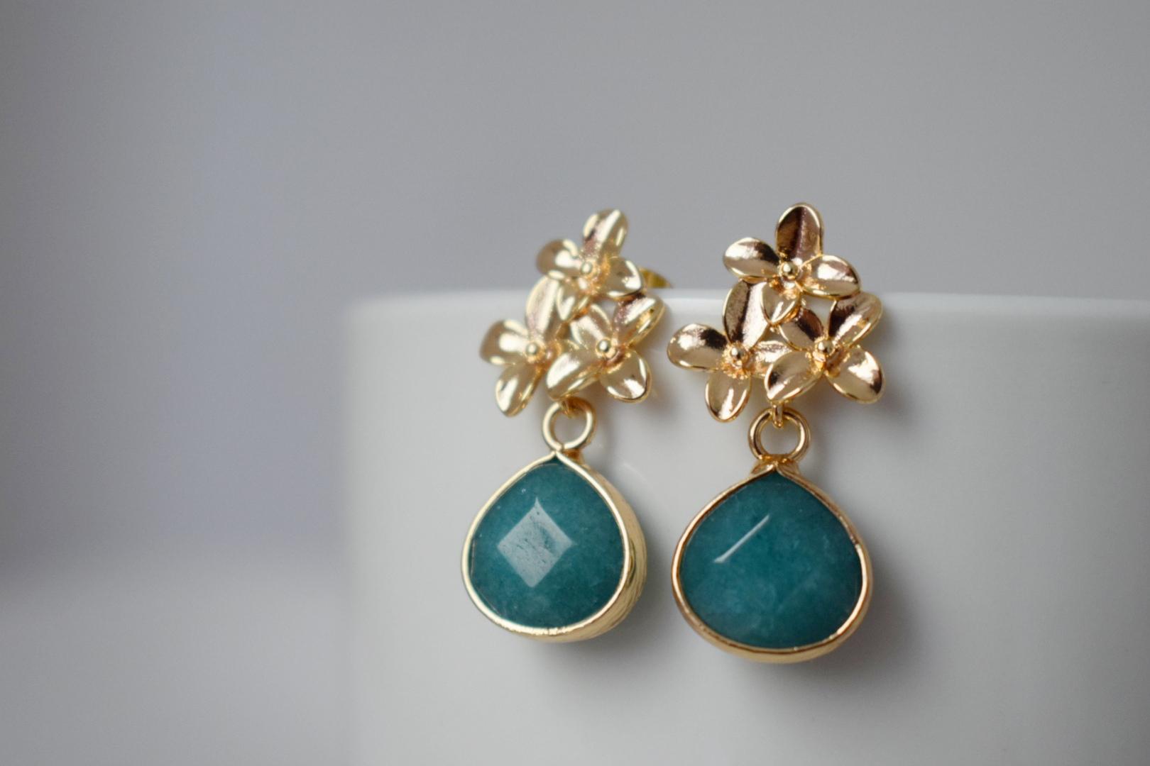Turquoise Jade Stud Earrings Dangle, Teardrop Gemstone Earrings, 18K Gold Flower Stud, Unique Handmade Boho Jewelry, Mother's Day Gift