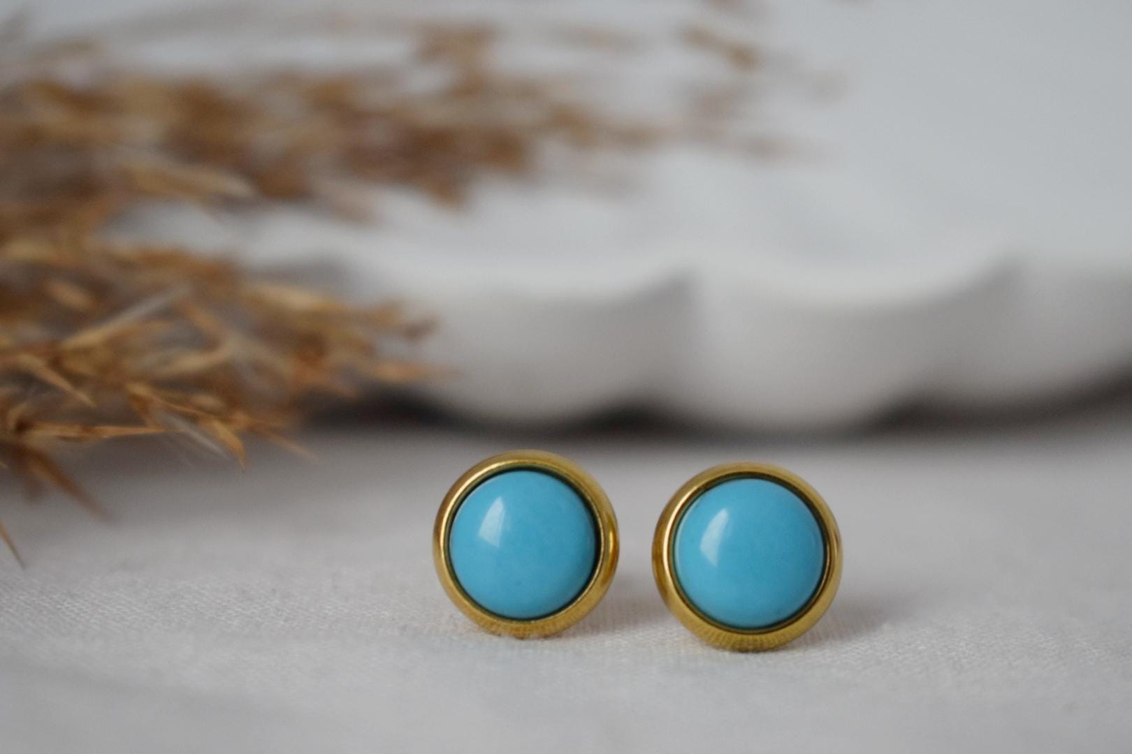 Synthetic Turquoise cabochons Synthetic Turquoise cabochons. 8mm massive stud ears frame and push back made of with high quality Gold Plated 304 stainless steel material, 2 extra silicon push back, jewelry glue. Matching jewelry is also available in our shop. Please check the link below for more details.Highlights