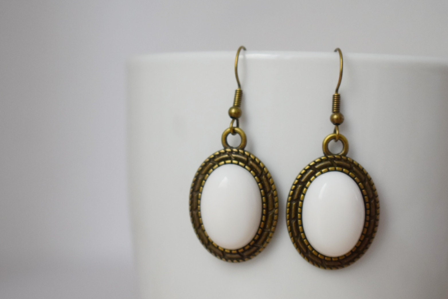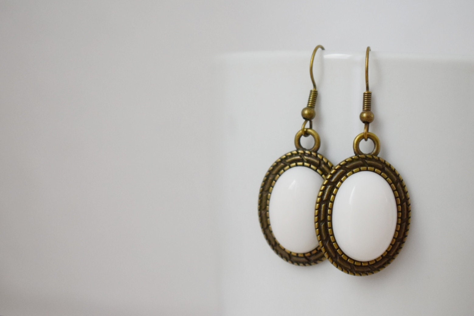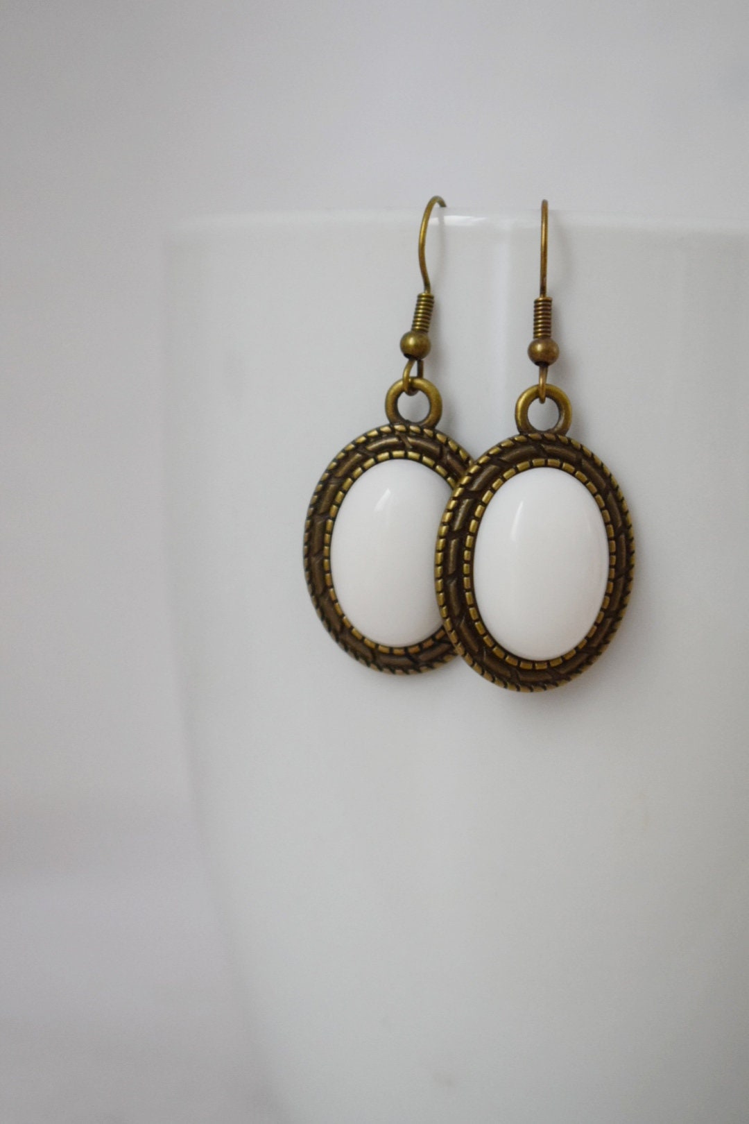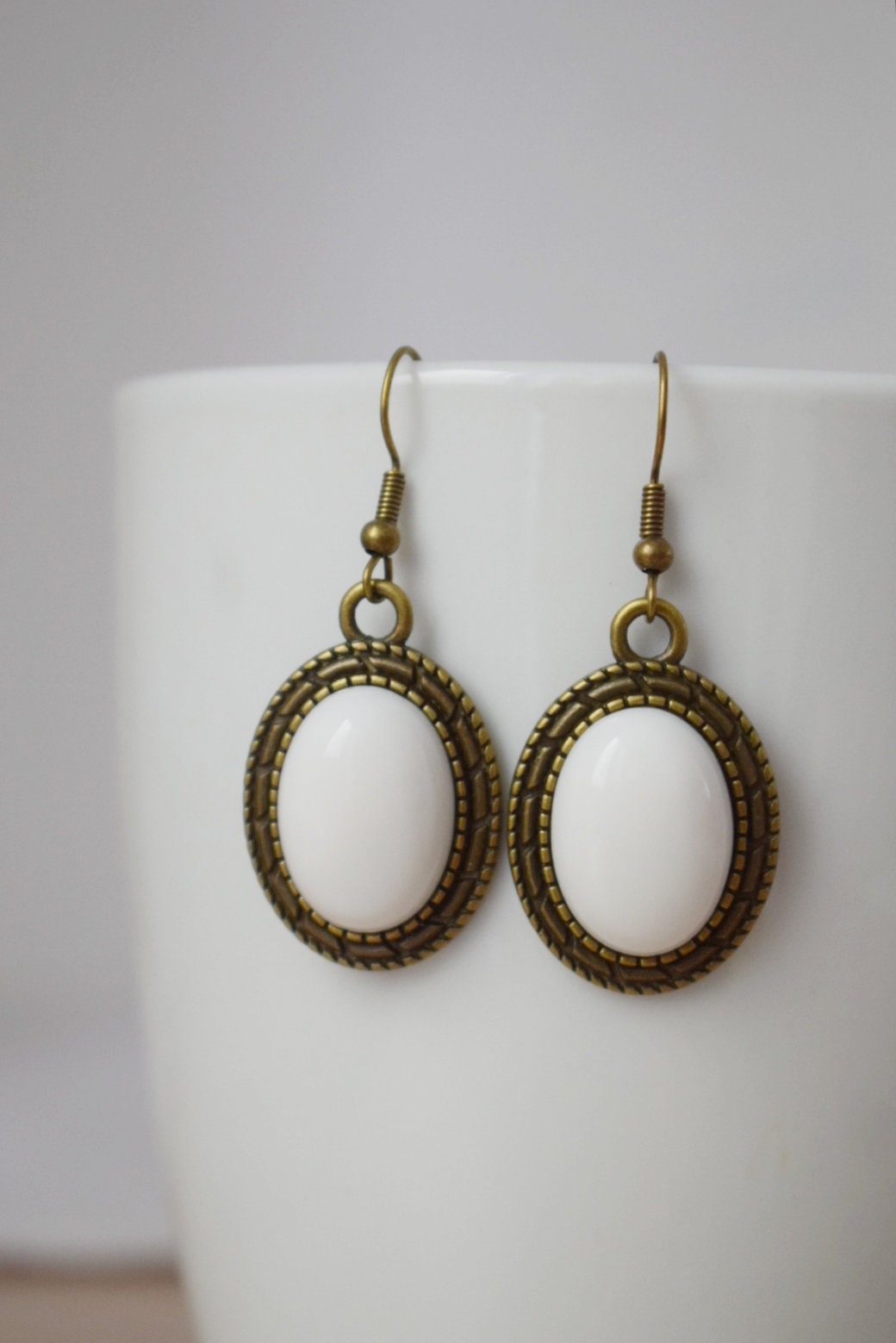 Oval white jade dangle ears, Vintage gemstone drop ears, Stone hanging ears, Statement filigree ears, Jewelry gift for women