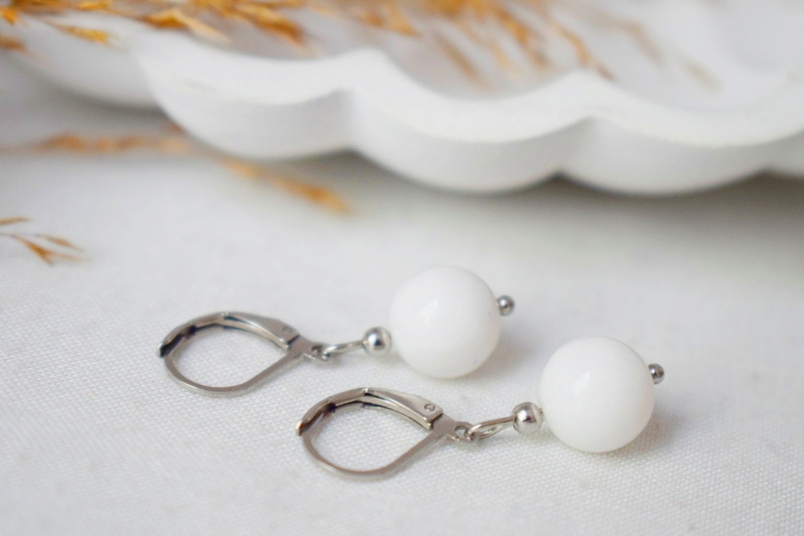 White jade earrings sterling silver 925, Huggie earrings with gemstone, Stone hoop earrings, Bead lever back earrings, Silver jewelry gift