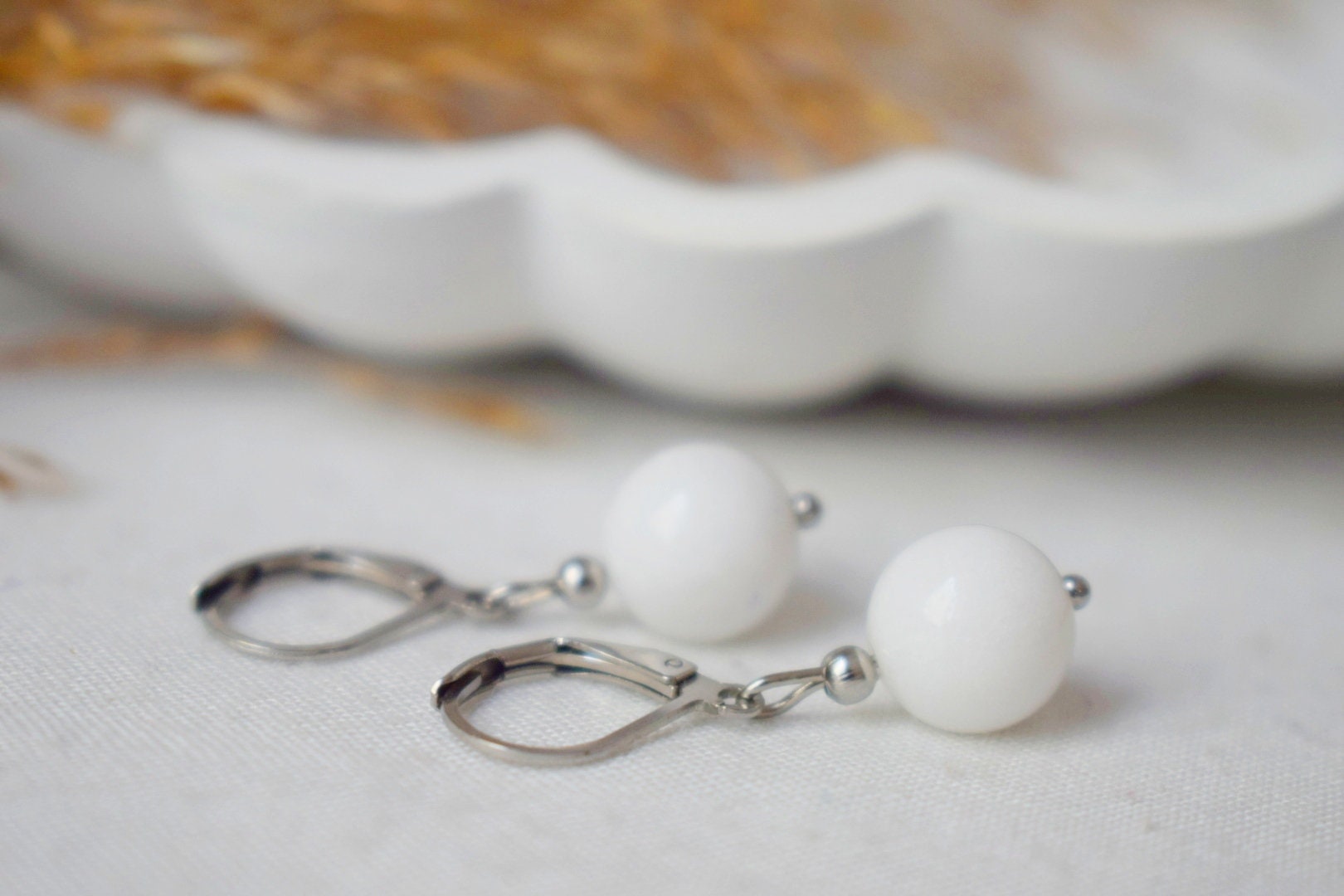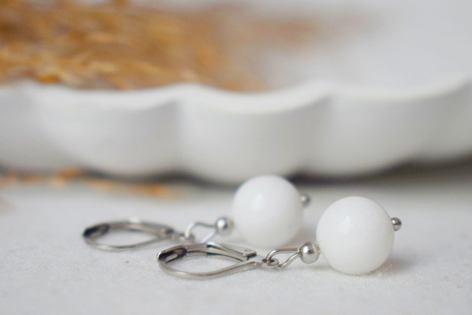 Item details Beautiful simple and elegant but stylish gemstone bead White Jade dangle and drop sterling silver ears