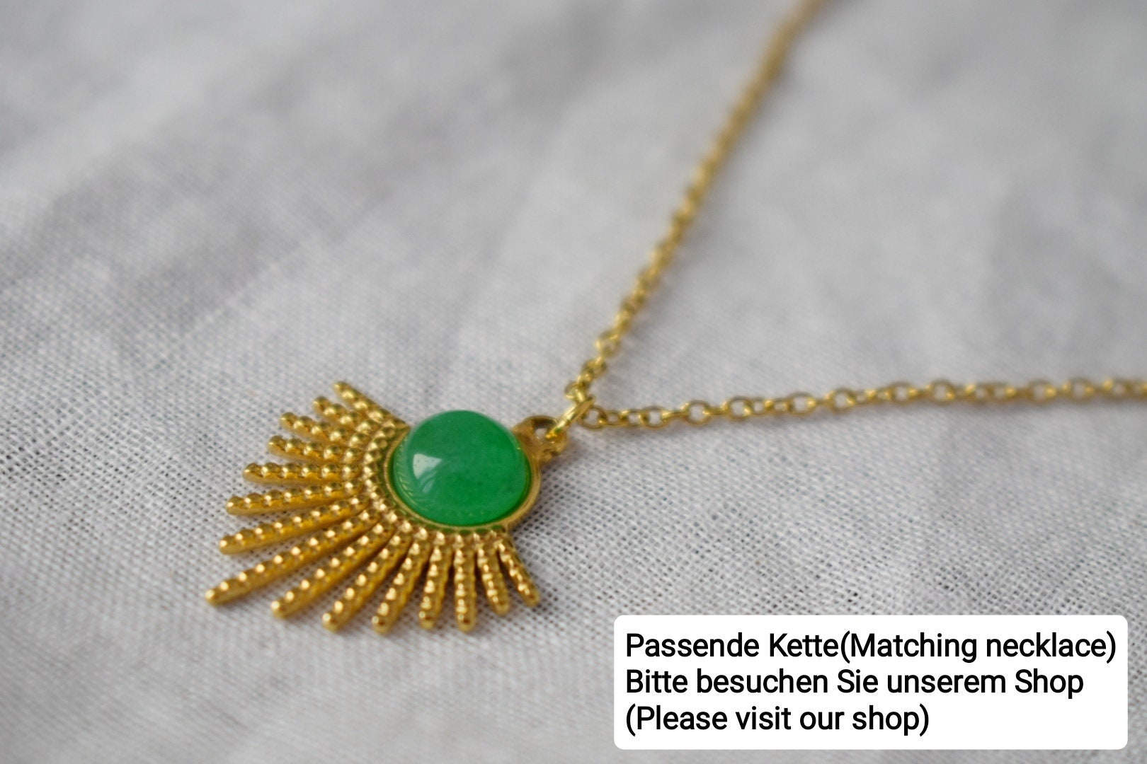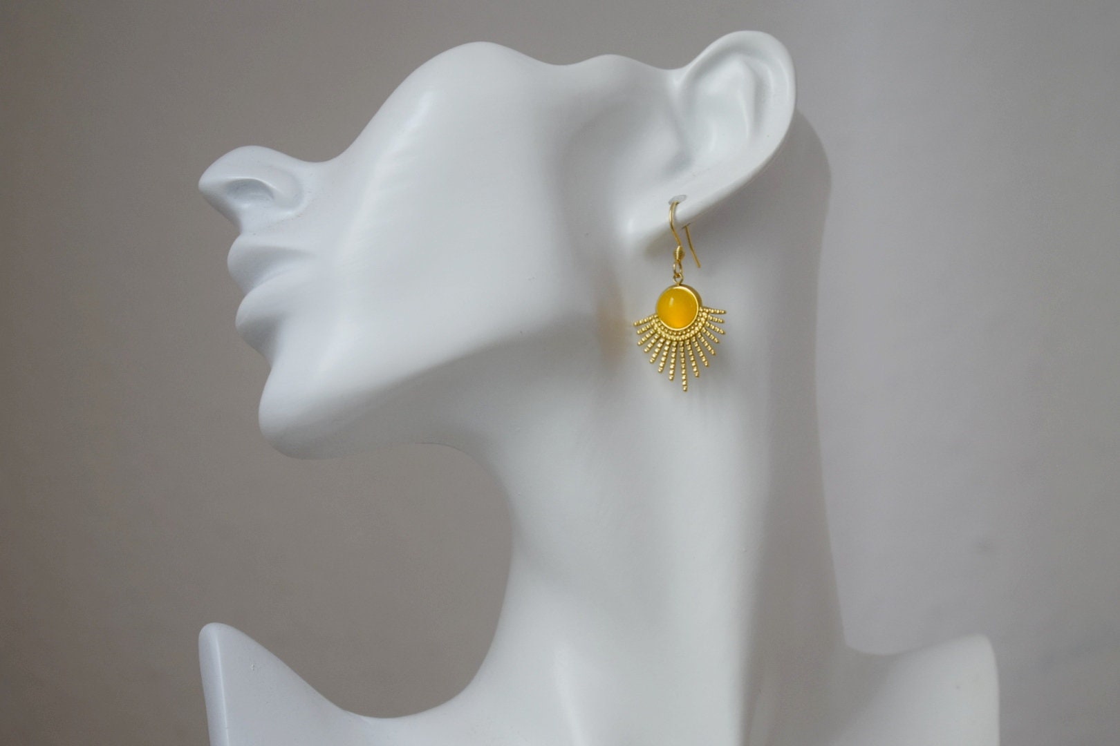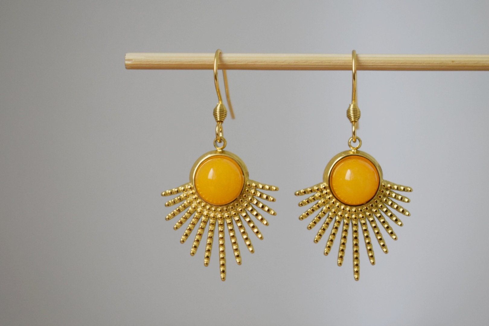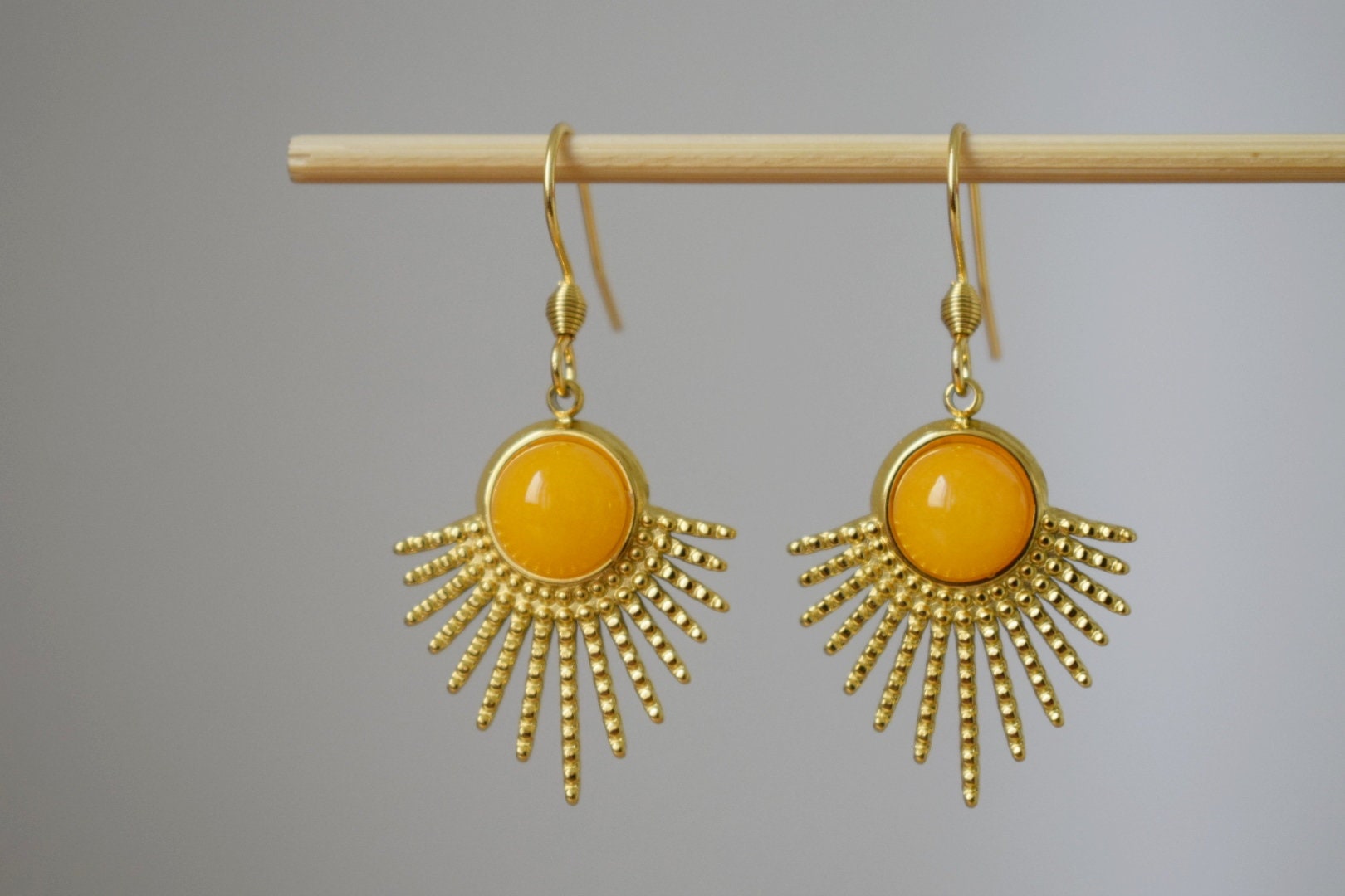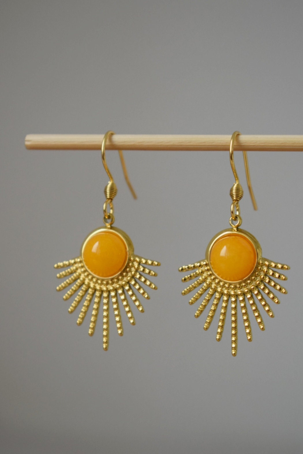 Yellow jade ears, Sun rays dangling ears, Sunburst, Gemstone drop ears, Celestial, 18k gold plated stainless steel, Jewelry gift for her
